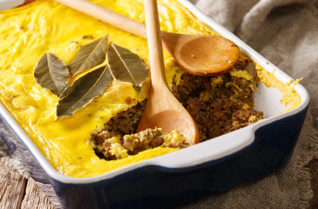 “Bobotie is a traditional South African dish, a flavourful fusion of Cape Malay influences made with spiced minced meat baked with an egg-based topping. It typically includes ingredients like curry powder, chutney, raisins, and soaked bread for a sweet-savoury flavour and is often served with yellow rice and slices of banana.”